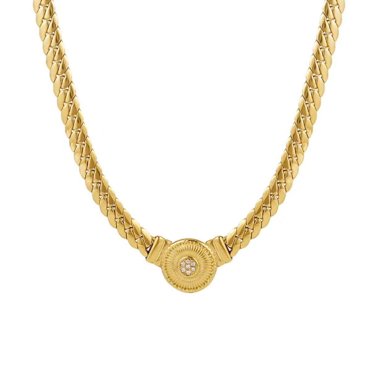 Pagamintas iš aukštos kokybės nerūdijančio plieno su 18K PVD auksu – ilgaamžis, atsparus vandeniui ir hipoalerginis.